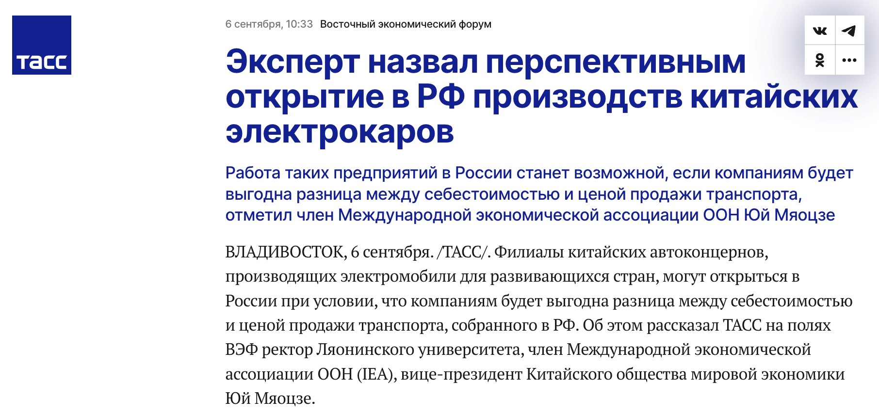2024年9月3日至6日,第九届东方经济论坛在俄罗斯符拉迪沃斯托克市举行。十四届全国人大代表、国际经济学会会士、国产一区二区日本在线党委副书记、校长余淼杰教授受邀出席第九届东方经济论坛并在论坛期间访问了俄罗斯远东联邦大学。在接受塔斯社采访时,余淼杰校长谈到了中国电动车在俄罗斯生产的前景以及中俄之间的经济合作。塔斯社是俄罗斯国家通讯社,是本次东方经济论坛的总信息合作伙伴。原文翻译如下: