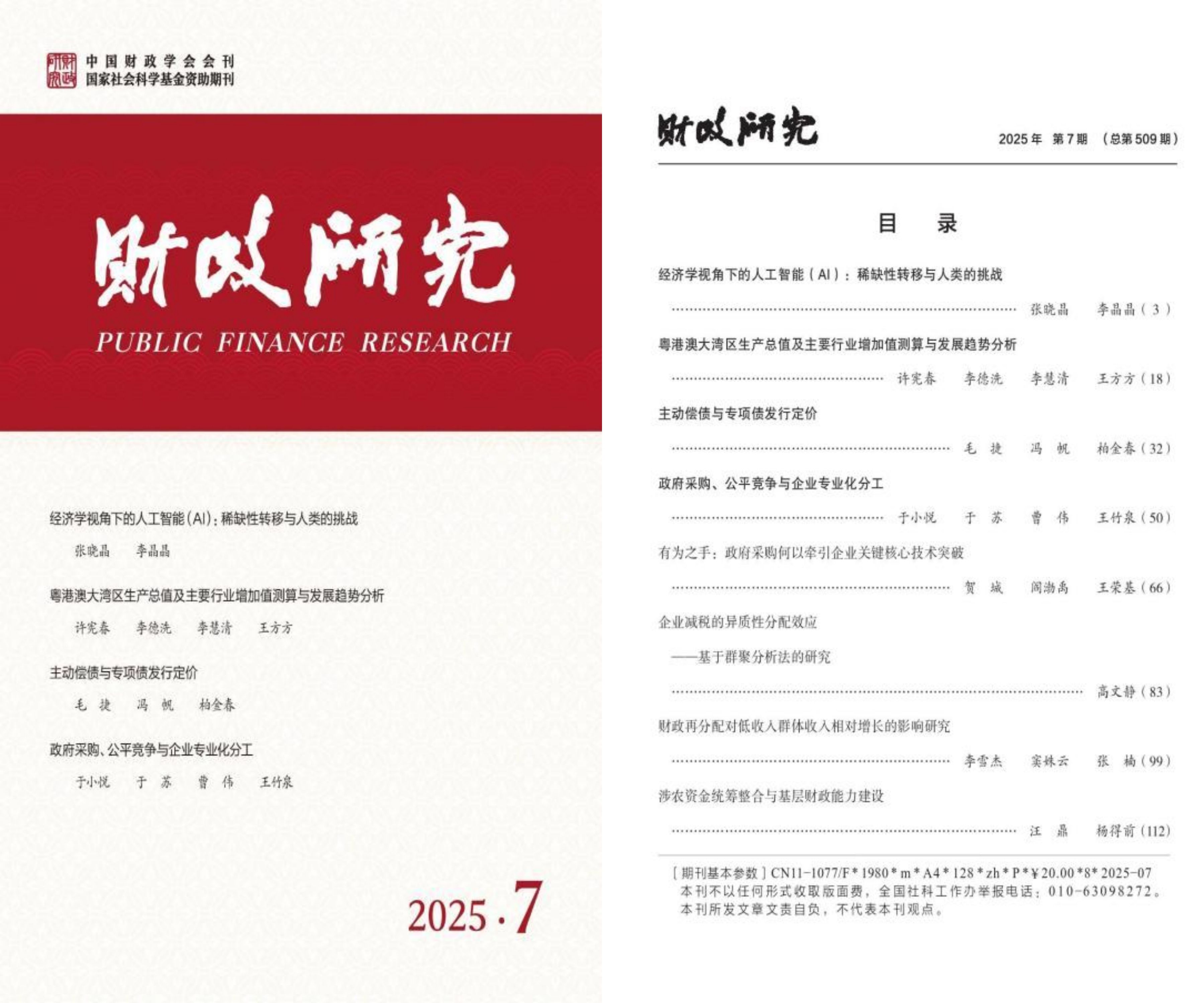 近日,经济学院贺城与本科生阎渤禹、博士生王荣基(通讯作者)合作在《财政研究》2025年第7期发表文章,题为《有为之手:政府采购何以牵引企业关键核心技术突破》。