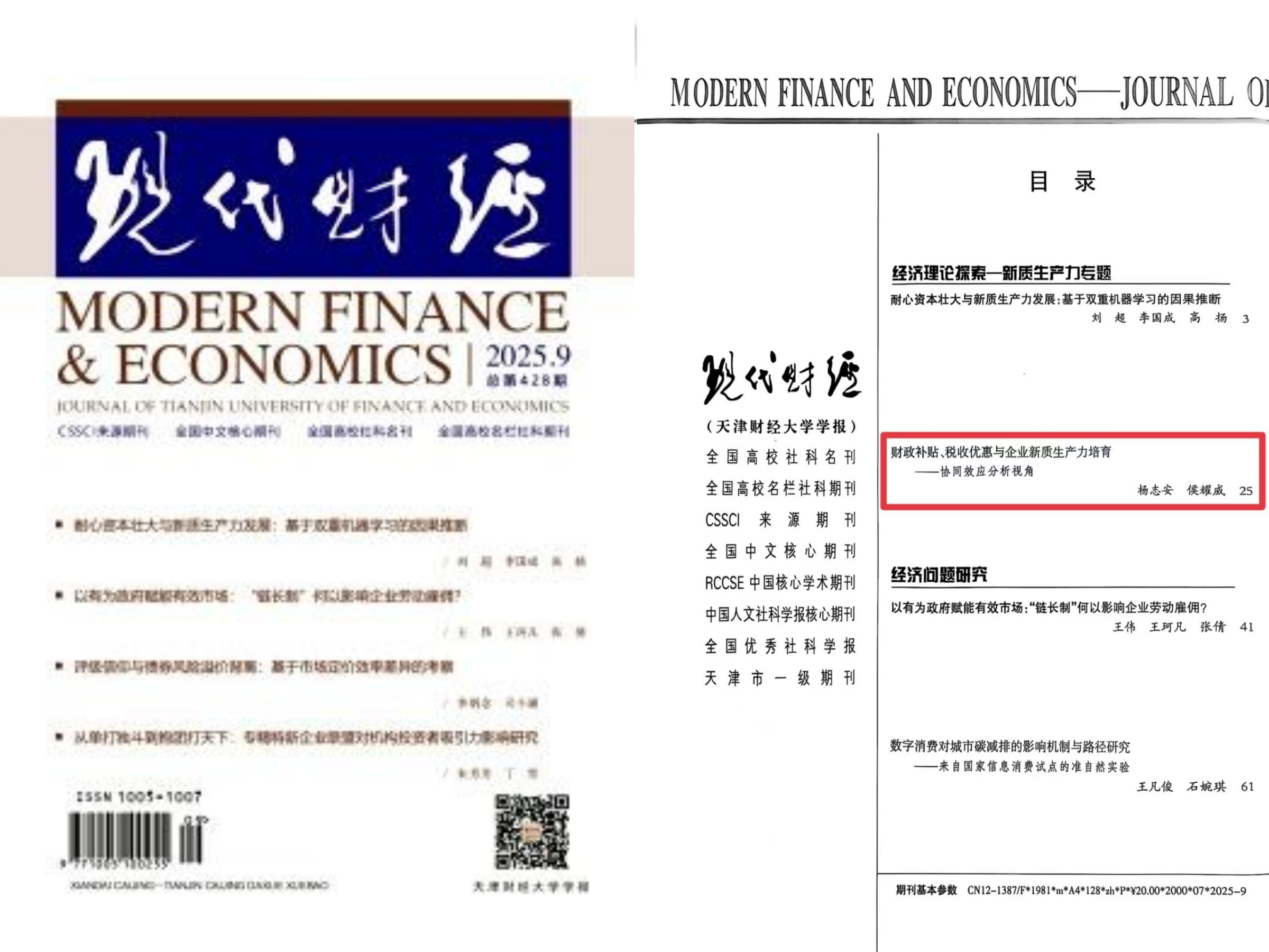经济学院杨志安教授与其指导的博士生侯耀威在CSSCI期刊《现代财经》2025年第9期发表论文《财政补贴、税收优惠与企业新质生产力培育——协同效应分析视角》。