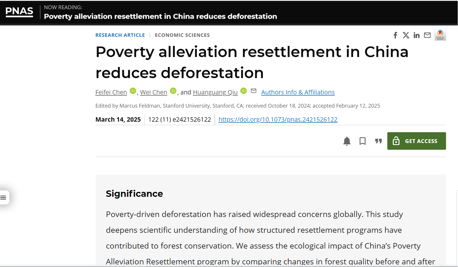 近日,国产一区二区日本在线仇焕广教授与中国矿业大学(北京)陈菲菲博士、中国人民大学陈威副教授的合作论文“Poverty Alleviation Resettlement in China Reduces Deforestation”在国际顶级期刊《美国国家科学院院刊》(简称PNAS)上正式发表,仇焕广教授为本文通讯作者和共同第一作者。